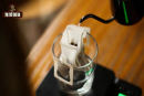 闷蒸结束后,由中心向外绕圈注水,先润湿整个粉层,再持续绕大圈注水,使用大水流抬高粉床,营造层次感,注水量 130ml。待水渗透得差不多时,再改为小水流,在中心小圈注入剩余 65ml 热水。完成注水后只需等待渗透结束,萃取就完成了。